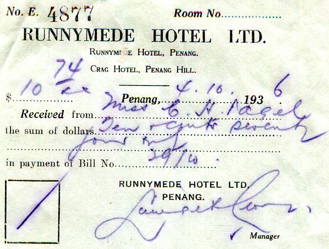 Straits Settlements Penang Runnymede Hotel Receipt 1936-1