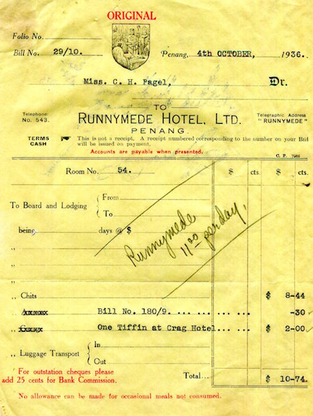 Straits Settlements Penang Runnymede Hotel Receipt 1936-3