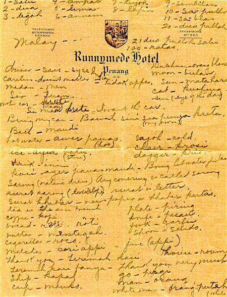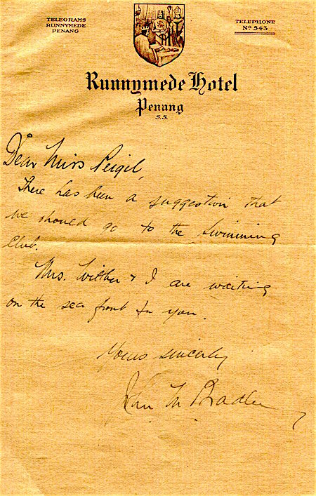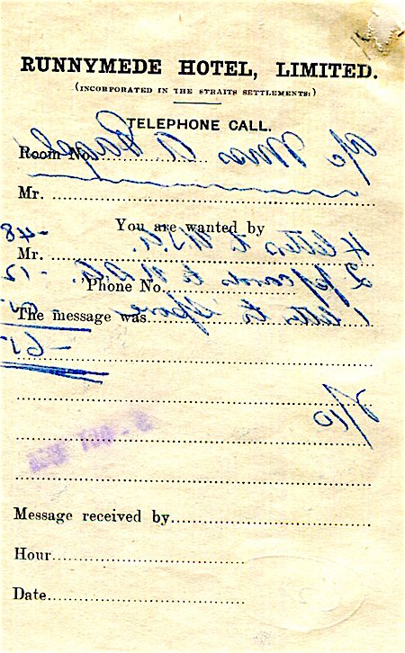 Straits Settlements Penang Runnymede Hotel Telephone Message 1936