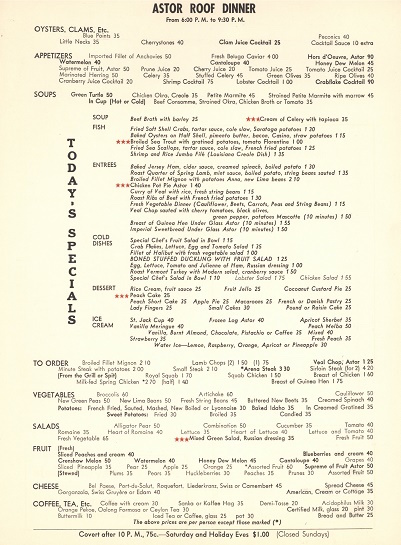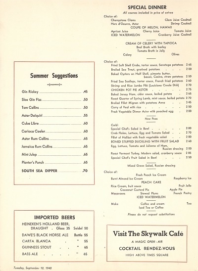 USA New York NYC Menu Hotel Astor Roof Garden 1940 Inside 1