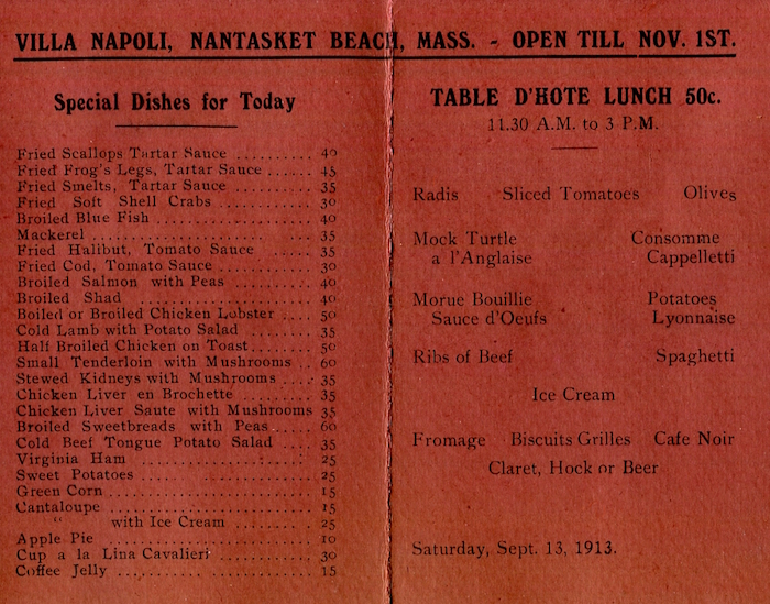 USA Massachusetts Menu Hotel Napoli Nantasket Beach 1913 Inside