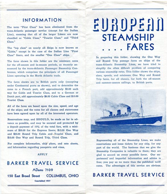 United States Travel Agency Barker Travel Service Brochure 1937 Front