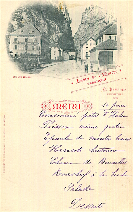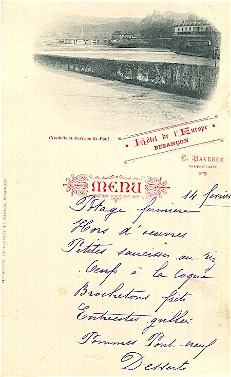 France Besancon Hotel Grand Hotel De Paris Menu 1916