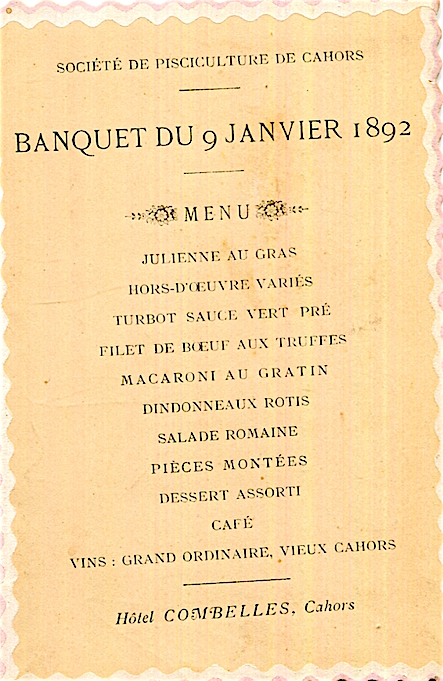 France Cahors Hotel Combelles Menu 1892