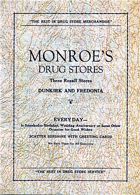 USA New York Dunkirk Menu Drug Store Monroes Soda Fountain 1930 Front