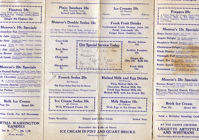 USA New York Dunkirk Menu Drug Store Monroes Soda Fountain 1930 Inside