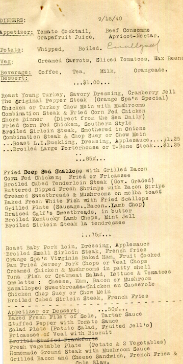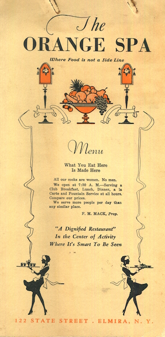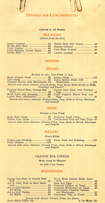 USA New York Elmira Menu Restaurant Orange Spa 1940 Inside 1