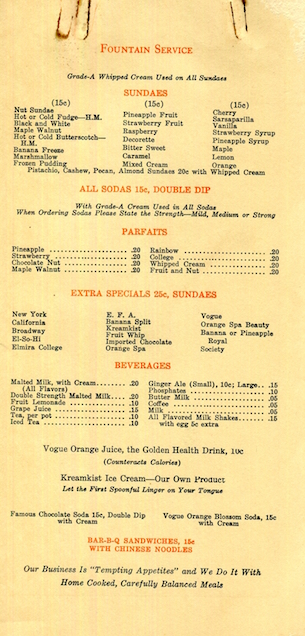 USA New York Elmira Menu Restaurant Orange Spa 1940 Back