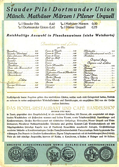 Germany Essen Hotel Handelshof Menu 1928 Back
