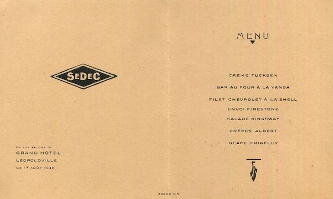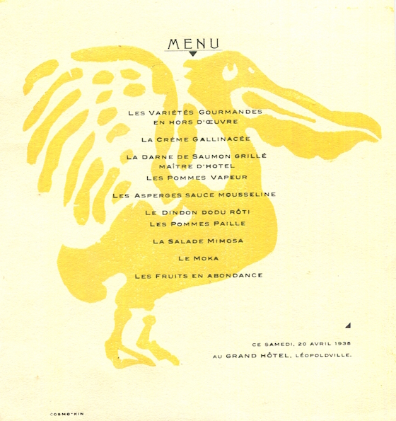 Belgium Congo Leopoldville Grand Hotel Menu 1933