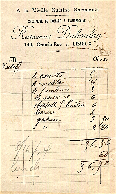 France Lisieux Restaurant Receipt Duboulay 1924