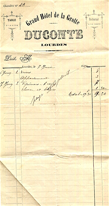 France Lourdes Hotel Grand De La Grotte Receipt 1889