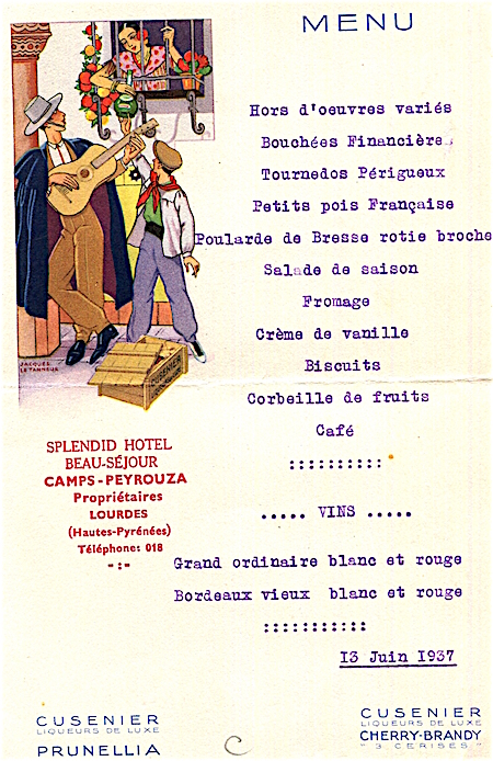 France Lourdes Hotel Splendid Beau Sejour Menu 1937