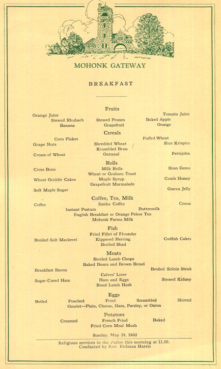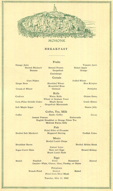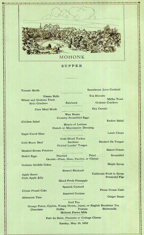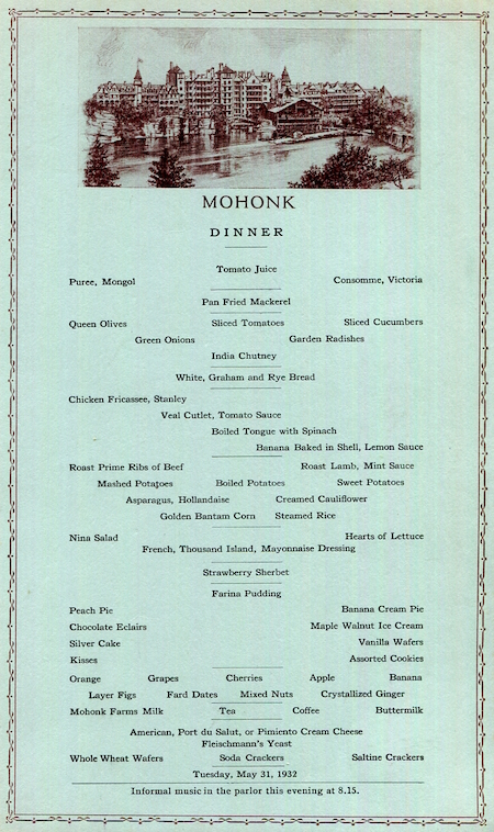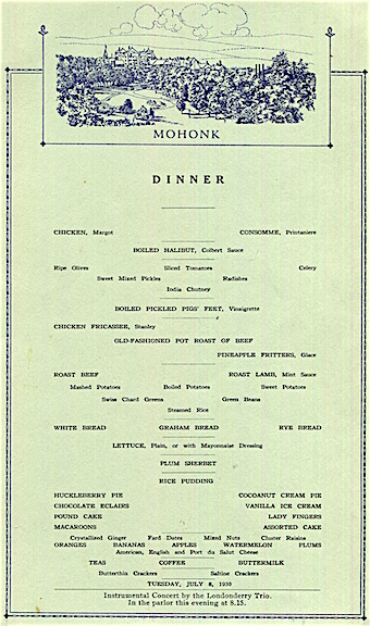 • USA New York New Paltz Menu Hotel Mohonk Mountain Lodge 1930