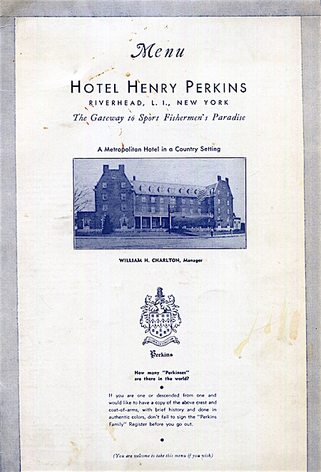 USA New York Riverhead Menu Hotel Henry Perkins 1932 Front