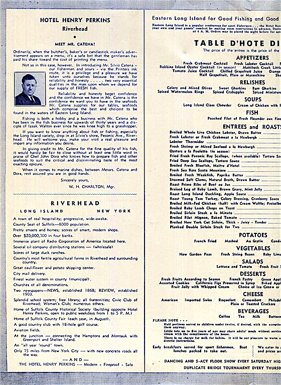 USA New York Riverhead Menu Hotel Henry Perkins 1932 Inside 1