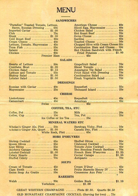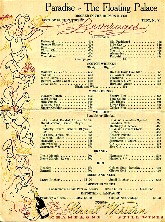 USA New York Troy Menu Restaurant Paradise 1930 Back