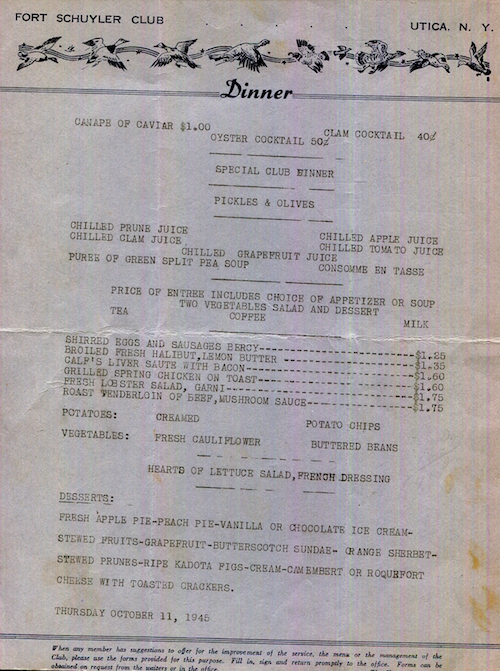 USA New York Utica Menu Restaurant Fort Schuyler Club 1945