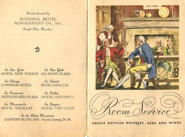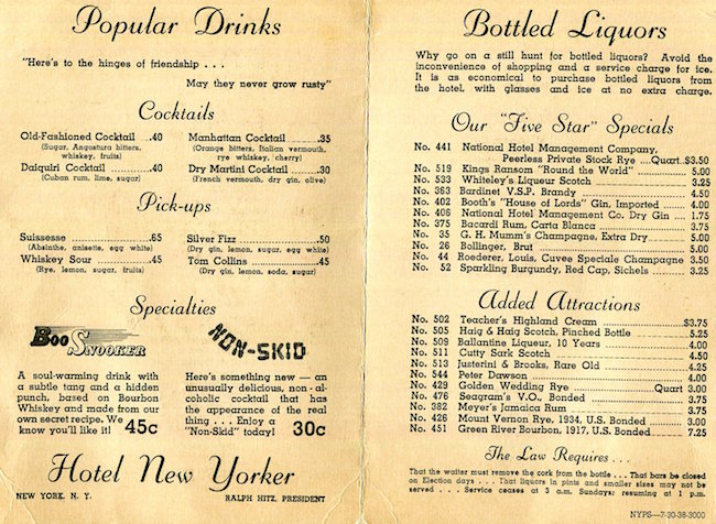 USA New York NYC Coctail Menu Hotel New Yorker 1938 Inside