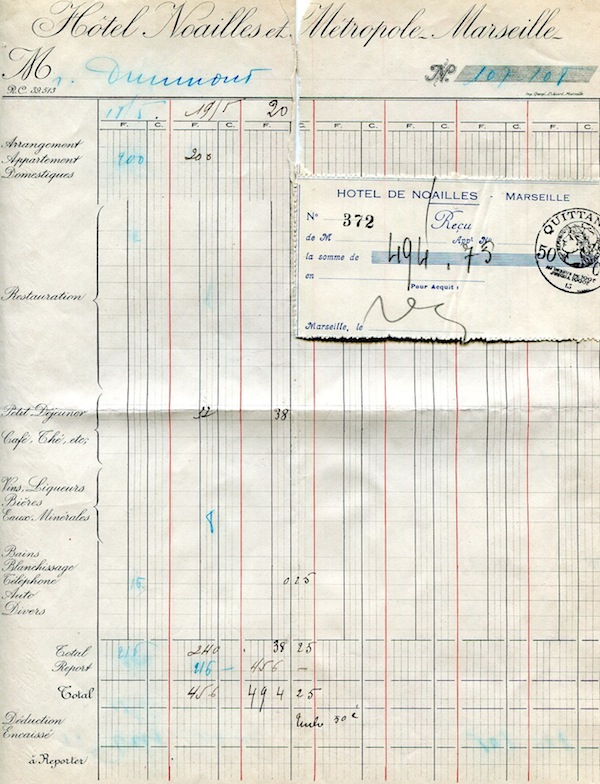 France Marseille Hotel Receipt Hotel De Noailles 1925