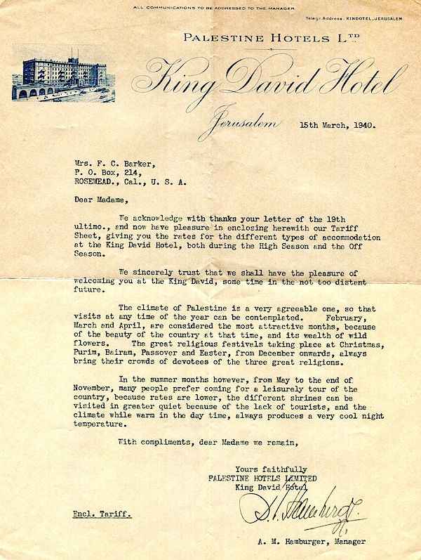 Palestine Jerusalem King David Hotel Brochure 1931 Front