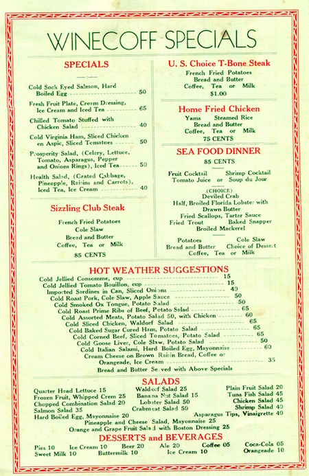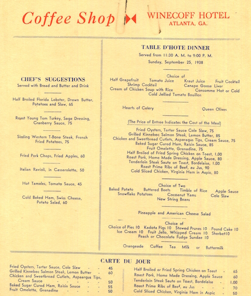USA Georgia Atlanta Menu Hotel Winecoff 1938 Back