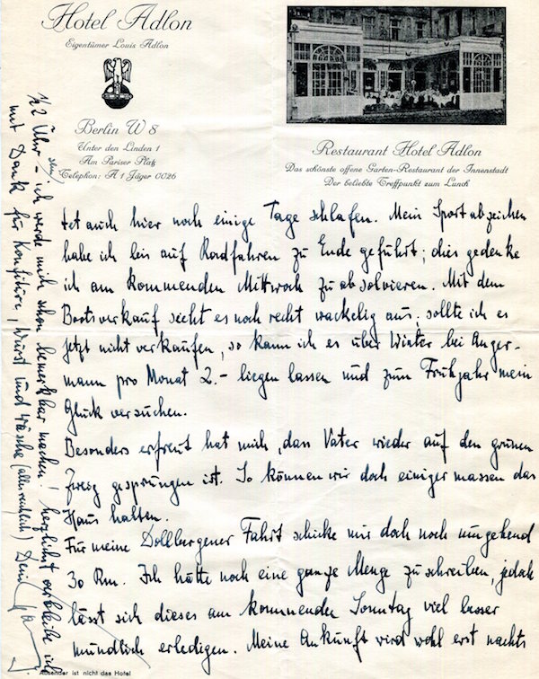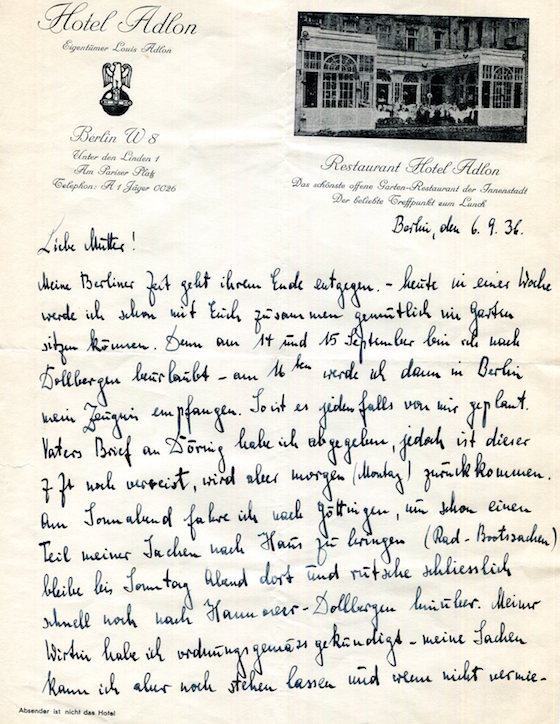 Germany Berlin Hotel Adlon Letter Pg 1 1936