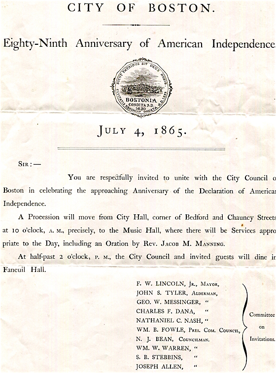 USA Massachusetts Boston Invitation 89th Anniversary Of American Independence 1865
