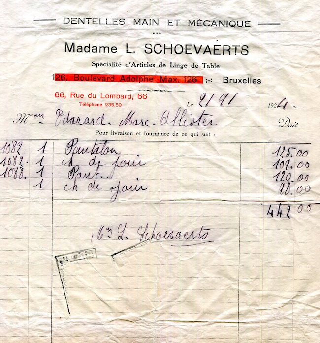 Belgium Brussels Commerce Madame L Schoevaerts Receipt Lace 1924