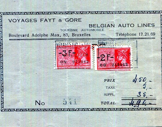 Belgium Brussels Commerce Voyages Fayt & Gore Travel Agent Receipt 1938