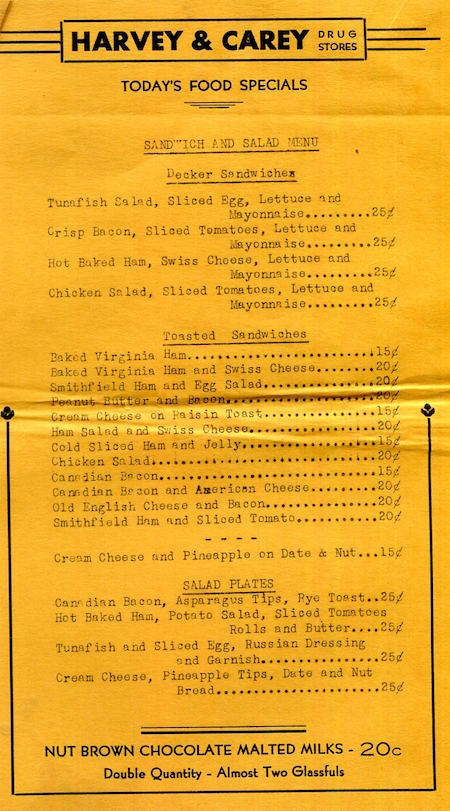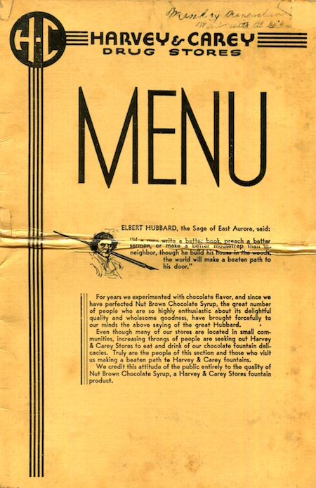 USA New York Buffalo Menu Harvey Carey Soda Fountain 1939 Front