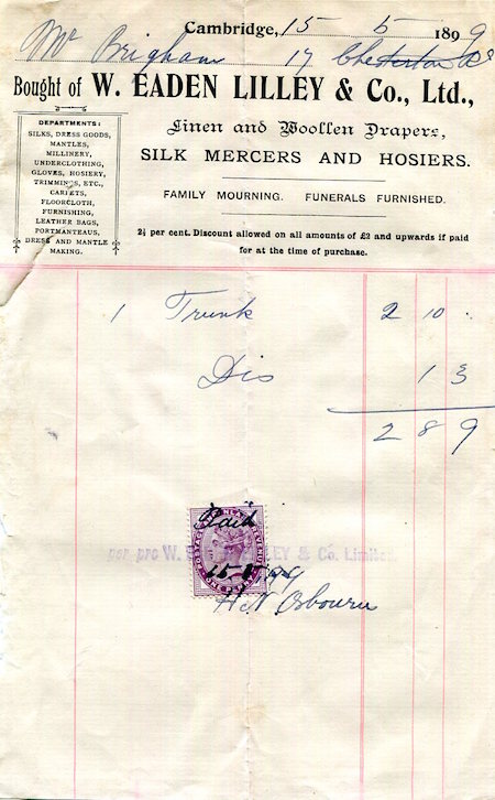 England Cambridge Commerce W. Eaden Lilley & Co Receipt 1899