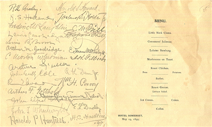 USA Massachusetts Cambridge Menu Hotel Somerset Harvard University Lampoon Dinner 1899 Front