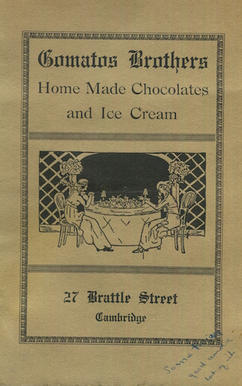 USA Massachusetts Cambridge Menu Restaurant Gomatos Brothers Chocolate ice Cream 1921 Front