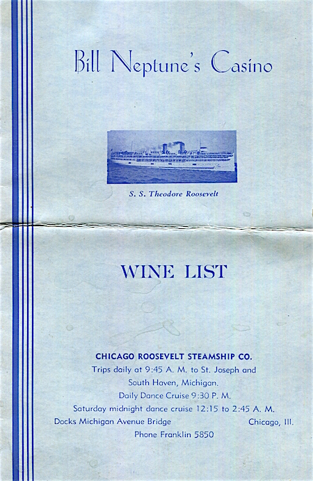 USA Illinois Chicago Wine Menu Casino Neptunes SS Theodore Roosevelt 1939 Front