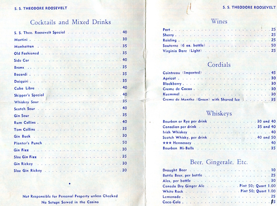 USA Illinois Chicago Wine Menu Casino Neptunes SS Theodore Roosevelt 1939 Inside