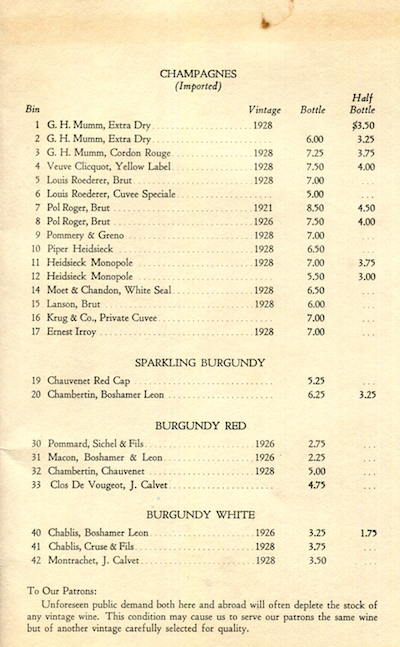 USA Illinois Chicago Wine Menu Hotel Somerset Lodge 1939 Inside 1