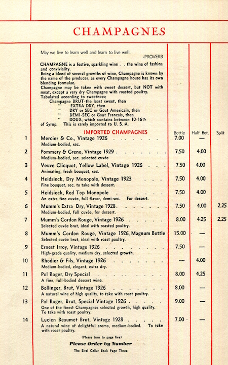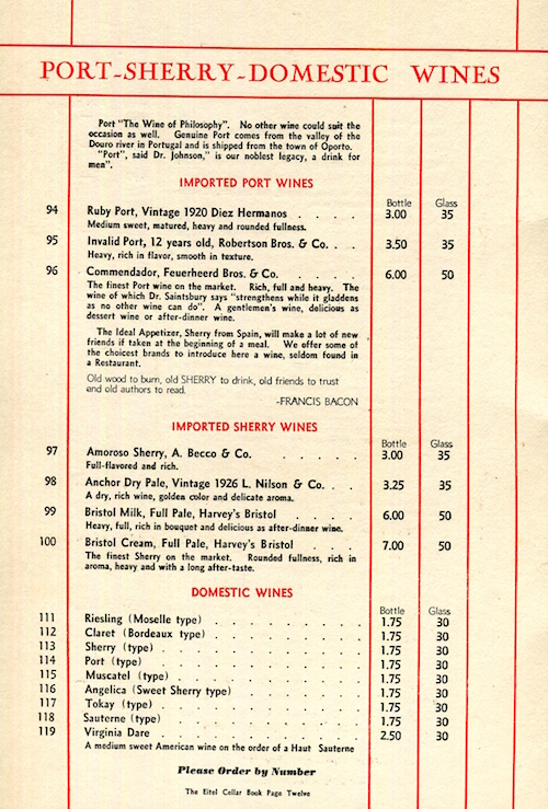USA Illinois Chicago Wine Menu Restaurant Eitel 1935 Front