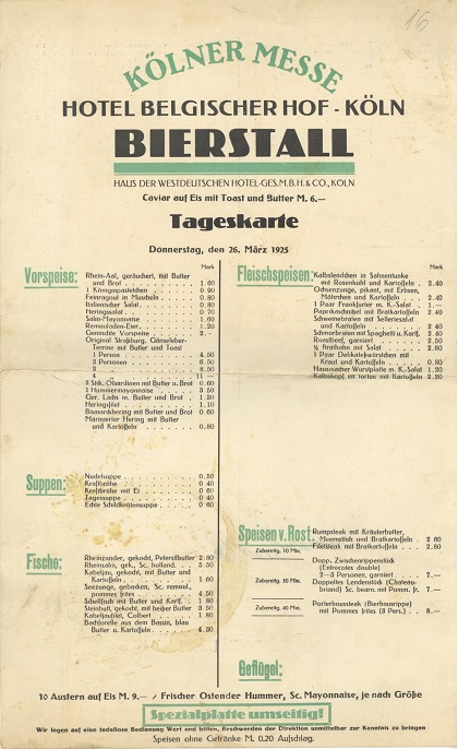 Germany Cologne Hotel Belgischer Hof Menu 1925 Front