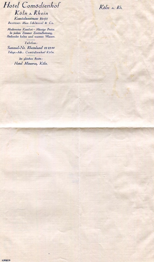 Germany Cologne Hotel Comödienhof Stationery 1931