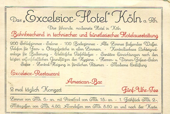 Germany Cologne Postcard Excelsior Hotel 1920 Back