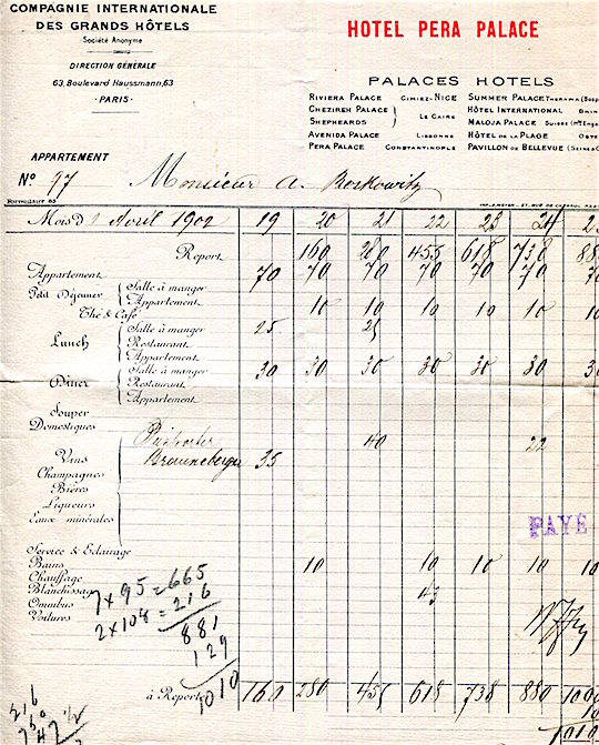 Turkey Constantinople Hotel Pera Palace Receipt Orient Express 1902