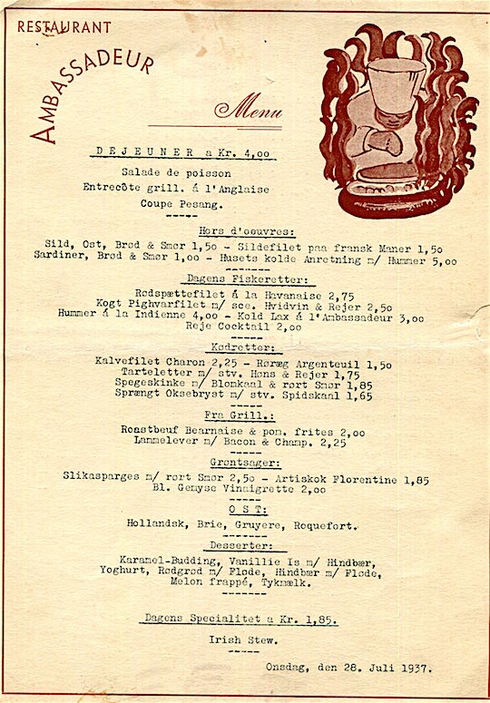 Denmark Copenhagen Restaurant Ambassadeur Menu 1937 Front