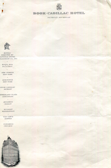 USA Michigan Detroit Stationery Hotel Book Cadillac 1930