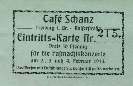 Germany Entertainment Province Black Forest Freiburg Breisgau Cafe Schanz Concert Ticket 1913