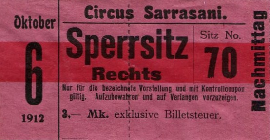 Germany Entertainment Province Black Forest Freiburg Circus Sarrasani Ticket 1912