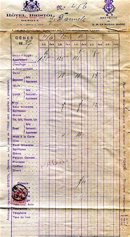 Italy Genoa Hotel Bristol Receipt 1927-2