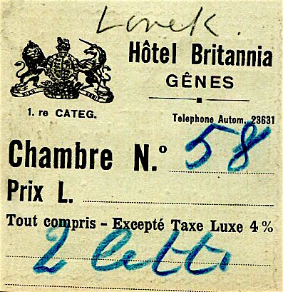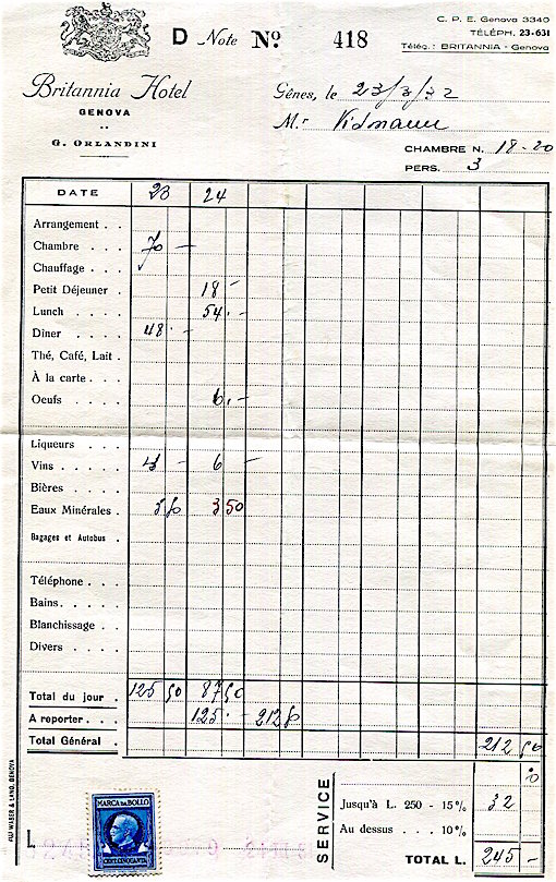 Italy Genoa Hotel Britannia Receipt 1932