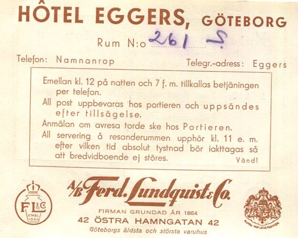 Sweden Gothenburg Hotel Eggers Notice 1934