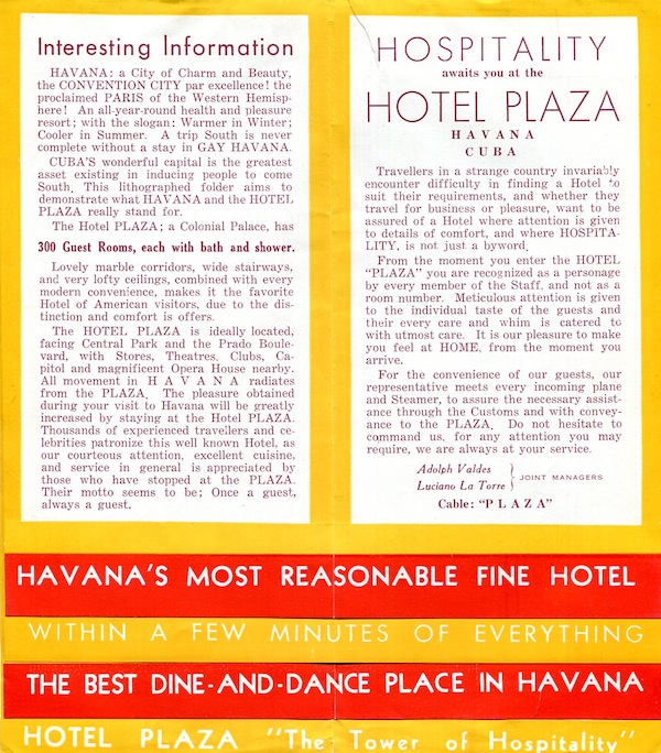 Cuba Havana Hotel Plaza Brochure 1938 Back